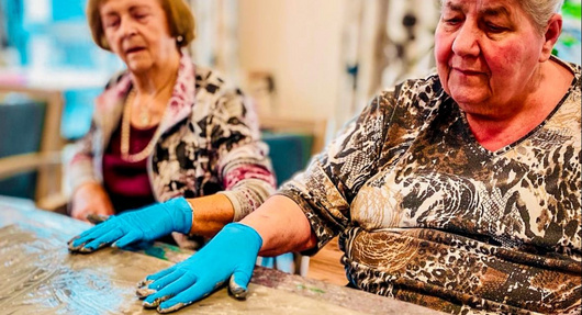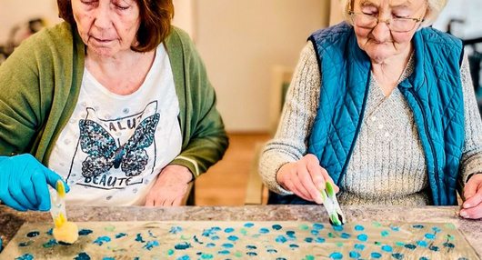 Unsere talentierten Damen – Frau Mager, Frau Hartmann, Frau Sebaldt, Frau Henseler, Frau Brachthäuser und Frau Weber – haben sich diesmal mit Acrylfarben auf einer großen Leinwand ausgetobt. Pinsel? Fehlanzeige! Stattdessen wurden Hände und Schwämme kurzerhand zu den Werkzeugen der Wahl erklärt!