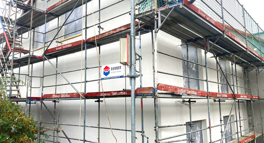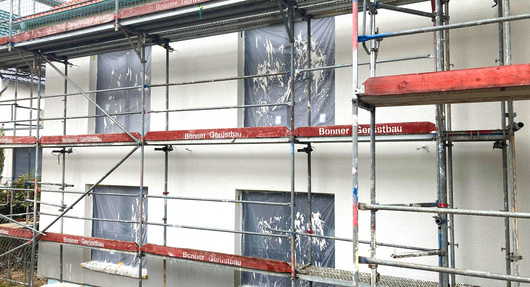 Die Fassade von Haus B wird in den nächsten Tagen komplett verputzt sein. Dann wird auch schon das Gerüst abgebaut und das Gebäude erstrahlt in voller Schönheit.