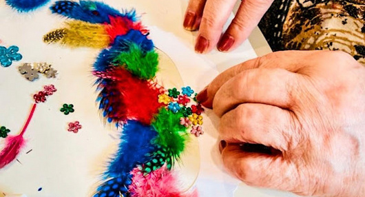 Gemeinsam fertigen sie eine bunte Palette an Karnevalsdekorationen. Besonders eifrig waren die Bemühungen beim Gestalten von Masken, wo Federn und Glitzersteine nicht gespart wurden. Frau Bönner nutzte die Gelegenheit zur kreativen Selbstentfaltung und gestaltete sogar eine Maske für sich selbst.
