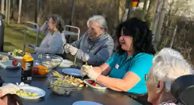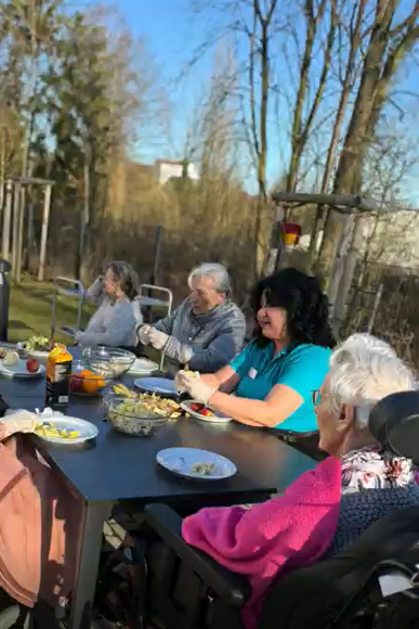 Mit den ersten warmen Sonnenstrahlen ging es raus in den Garten der Libento Seniorenresidenz Solingen, wo Obstsalat geschnitten wurde.